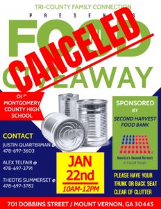 Due to inclement weather, the Food Giveaway is canceled for January. We will post when the next Food Giveaway will take place.